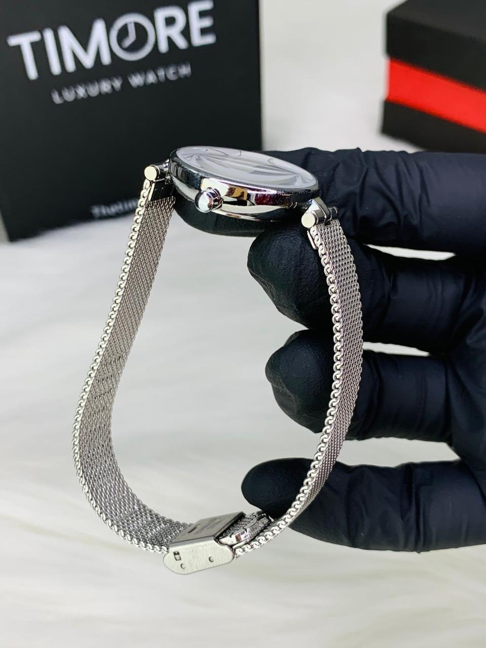 - Elegant silver stainless steel mesh strap with an adjustable clasp