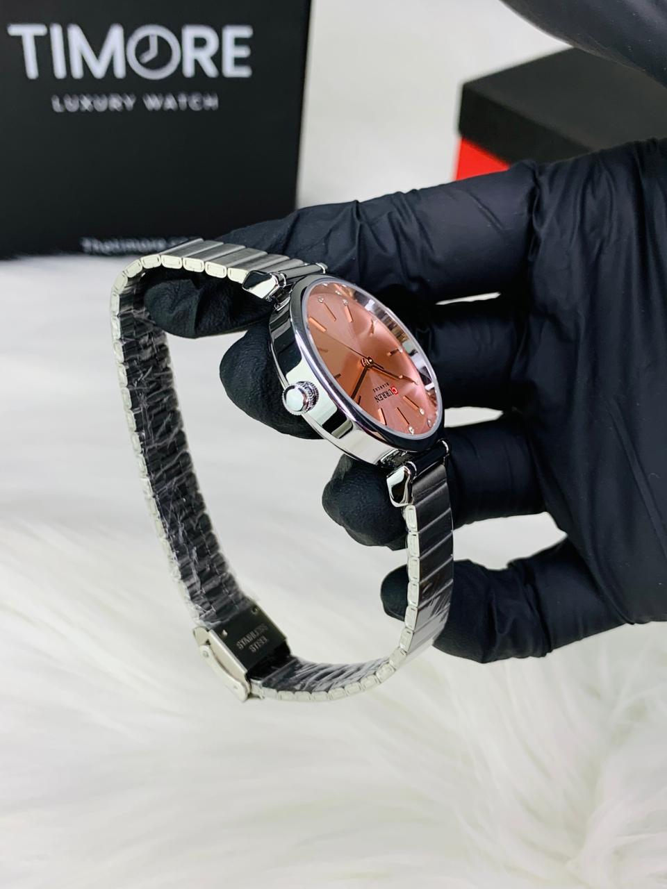- Elegant pink sunray dial adorned with sparkling crystal hour markers.