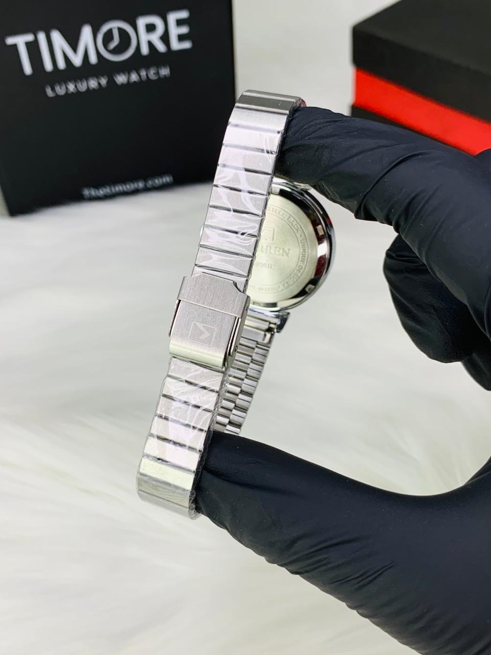 - Features a sleek, polished silver-tone case with a modern, slim profile.