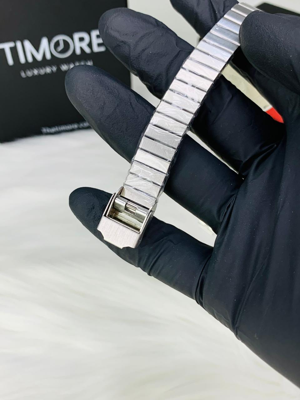 - Sophisticated silver metal strap with a refined horizontal-link design.