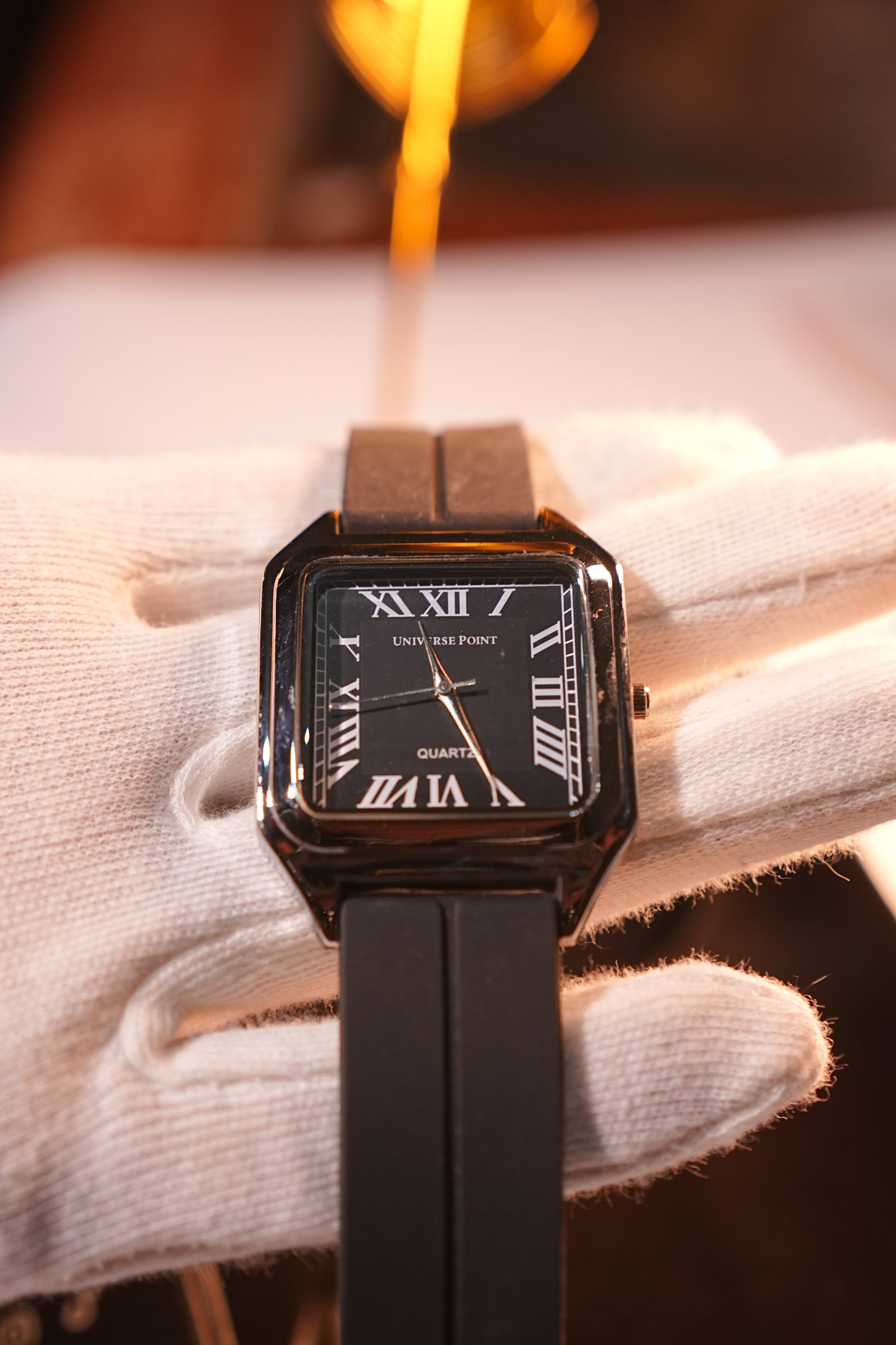 - Elegant square dial with Roman numeral design